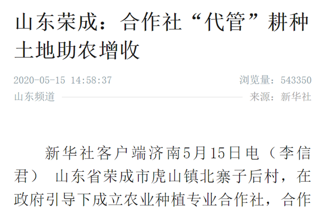 ??????近日,央視《朝聞天下》、新華社客戶端等國家級媒體頻頻聚焦榮成通過合作社“代管”土地穩面積、提質量、助農增收。