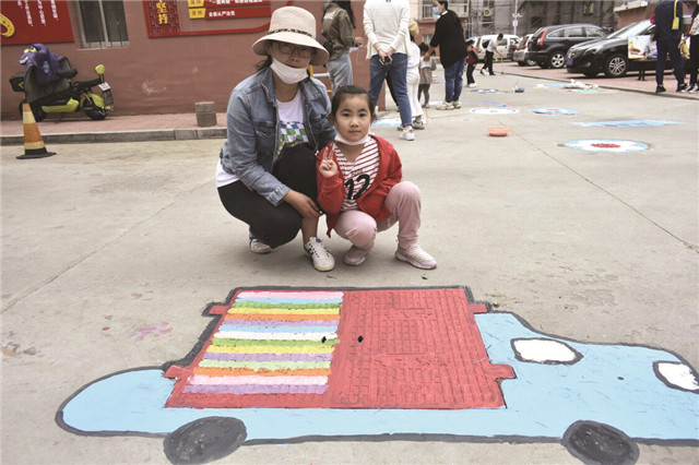 ??????東北村社區兒童在井蓋上涂鴉。苗琳 攝