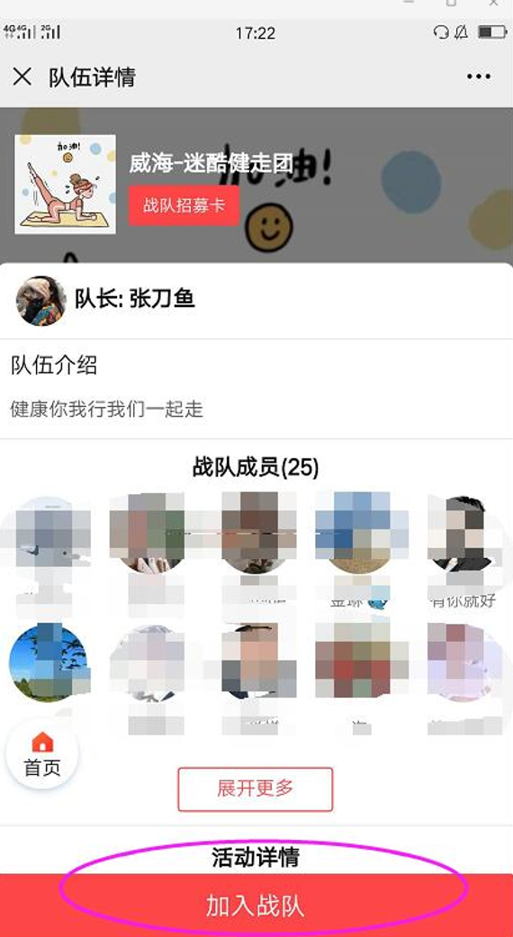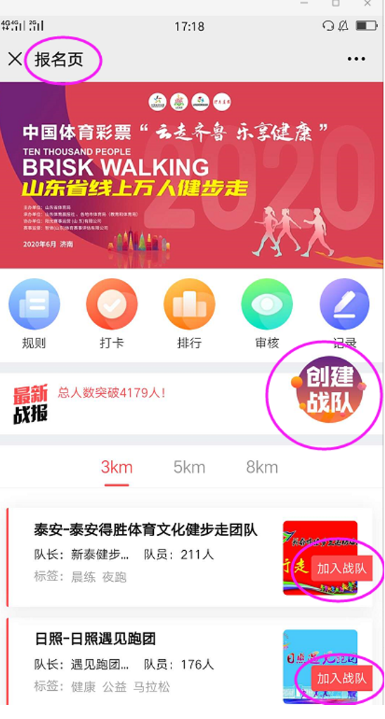 ??????目前,威海已經(jīng)有威海迷酷健走團(tuán)、威海市馬拉松協(xié)會(huì)、威海市徒步協(xié)會(huì)等戰(zhàn)隊(duì),選擇威海任一戰(zhàn)隊(duì),點(diǎn)擊加入戰(zhàn)隊(duì)。