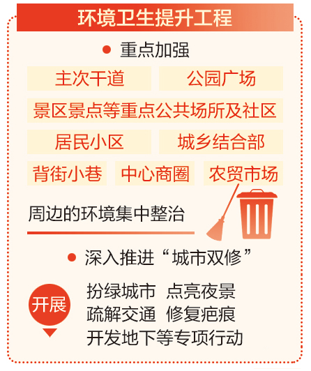 ??????作為文明城市評選的“必考項”,環(huán)境整潔是展現文明的常規(guī)動作。《方案》明確將重點加強主次干道、景區(qū)景點等重點公共場所及社區(qū)、居民小區(qū)、背街小巷等周邊環(huán)境的集中整治,徹底解決環(huán)境臟亂差、損壞公共設施、路面坑洼等問題。