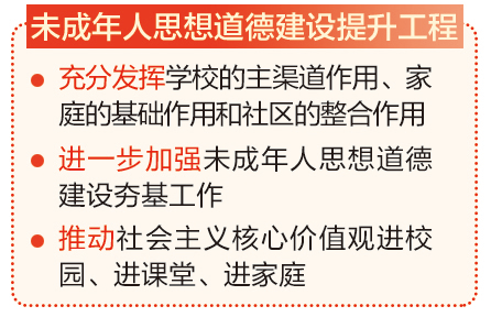 ??????此外,未成年人思想道德建設工作作為全國文明城市創(chuàng)建的前置條件和單獨測評考核的重要內容,《方案》明確要進一步加強未成年人思想道德建設夯基工作,組織“扣好人生第一粒扣子”主題教育實踐活動,推動社會主義核心價值觀進校園、進課堂、進家庭。推進城市社區(qū)未成年人實踐活動場所建設,加強未成年人心理健康教育站點建設,做好未成年人心理健康輔導工作。