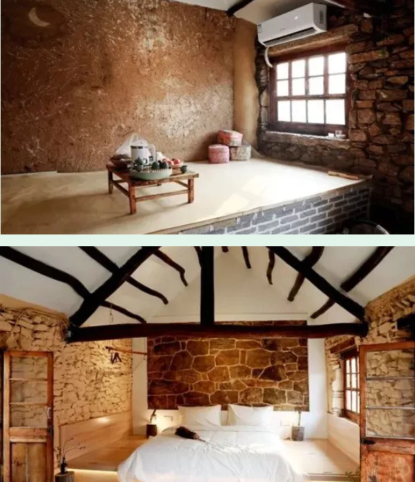 穿堂過屋,來到臥室,屋內各處均被精細裝修過,老舊石墻被粉刷成暖黃色,壁爐、躺椅、榻榻米、沙發床墊等的擺設,讓這里有些小資情趣。