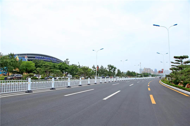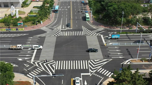 按照“高速公路”標準,全面實施道路罩面工程,采用改性瀝青新材料,施工機械“一字長龍”,路面鋪設一次成型。改造增設導流島16個,路口通行能力提升了20%以上。