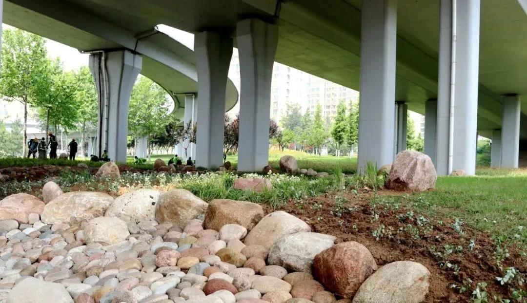 ??????此處立交橋下常年光照不足,水土易流失,加上又是鹽堿地,不利于綠化苗木的成活,因此結合先進的現代造景工藝,對橋下綠地進行“旱溪”改造。