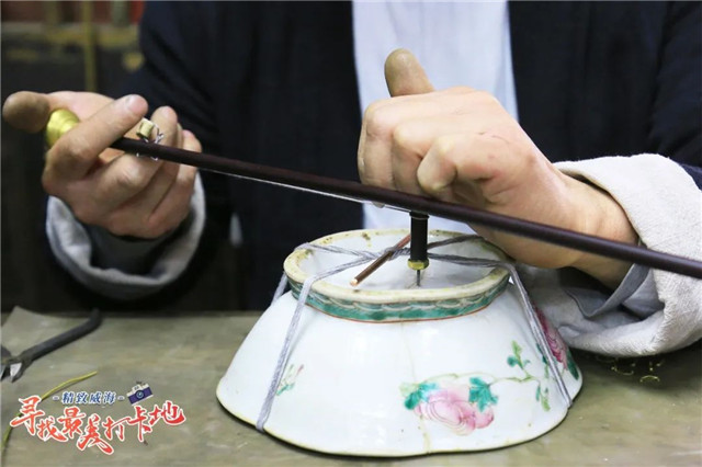 鋦瓷全過程包括找碴、捧瓷、打孔、制釘、上釘和彌縫。看起來不難,但每個步驟都是細心活。對上碎片,細繩綁定,上弓打眼,截銅造鋦,揚錘敲鋦……每一步操作都考驗著鋦匠手頭功夫的準確性和熟練度。