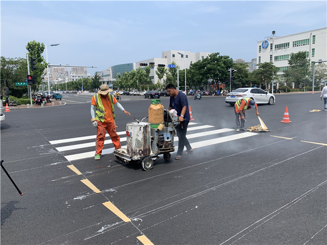 ??????熱熔車在路邊轟鳴,一旁的工作人員推著熱熔劃線機(jī),沿著道路,在事先標(biāo)記好的位置,涂上道路標(biāo)線的專用涂料……8月3日,烈日當(dāng)頭,科技路與錦州路交叉口,7位工作人員正在對該路段的標(biāo)線進(jìn)行重新施劃。