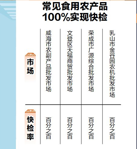 ??????威海市市場監督管理局食品流通安全監管科科長王方文介紹,我市現有威海市農副產品批發市場、文登區天福商貿批發市場、榮成市廣源綜合批發市場、乳山市金谷園農機批發市場4家食用農產品批發市場。過去,4家市場通過自建快速檢測室的方式,自行對食用農產品進行檢測,但存在檢測覆蓋品種少等問題。為嚴把食用農產品市場準入關,今年年初,我市各區市市場監管局通過招標,篩選確定檢測能力強、服務水平高的第三方檢測機構進駐批發市場開展快檢。同時,也對快檢人員進行了嚴格篩選,確保快檢的專業性和規范性。