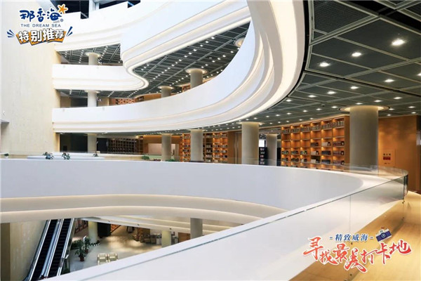 圖書館最具有設計感的樓層,便是連接五、六樓的“書山”,沒錯,就是用書籍壘起的“高山”,有著“書山有路勤為徑”的寓意,這里也是整個圖書館最佳觀景平臺。