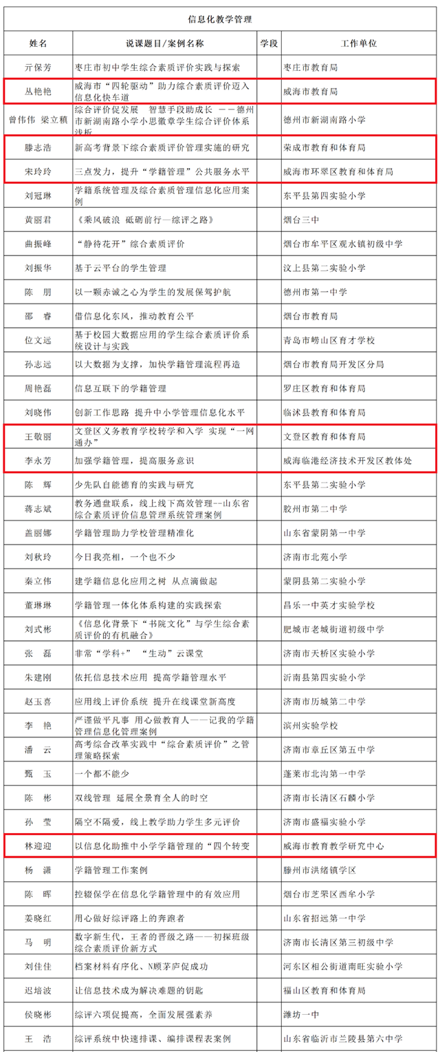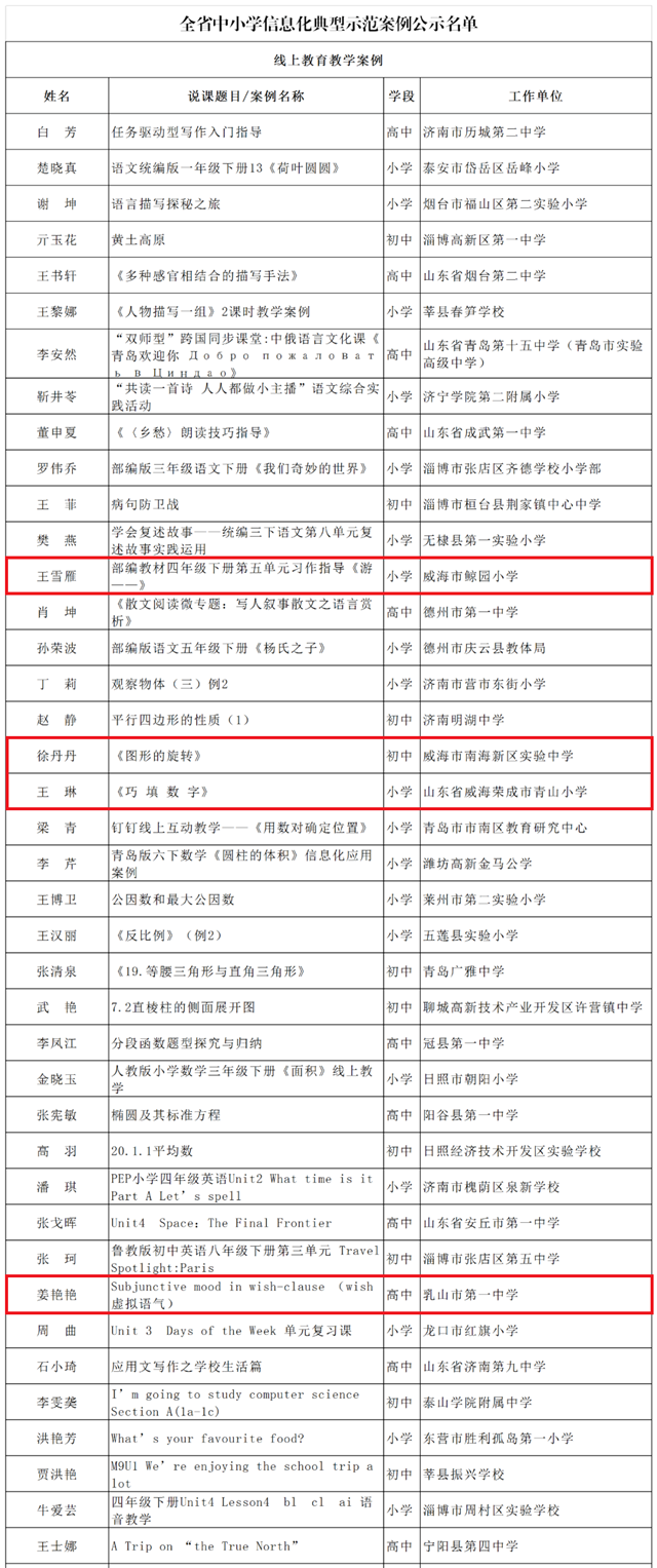 ??????根據(jù)《山東省教育廳關(guān)于舉辦2020年全省中小學(xué)實(shí)驗(yàn)教學(xué)說(shuō)課和信息化典型示范案例征集活動(dòng)的通知》要求,經(jīng)各市推薦,通過(guò)網(wǎng)上申報(bào)、專家評(píng)審等程序,最終確定線上教學(xué)82項(xiàng)、信息化管理177項(xiàng)為省級(jí)典型示范案例,威海17項(xiàng)案例上榜!現(xiàn)予以公示,公示期為2020年9月21日至2020年9月25日。