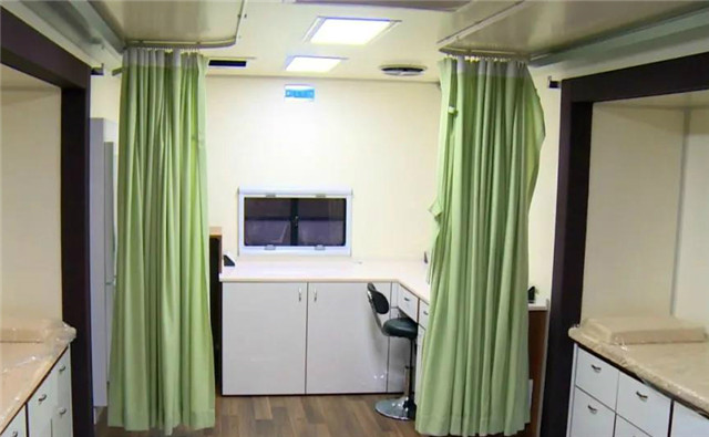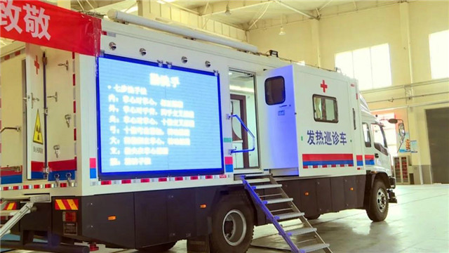??????威海廣泰特種車輛有限公司副總經理蔣旭強介紹:“通過不同功能的醫療車組合搭配,只需7到8臺車就可以具備一個三甲醫院的全部功能。”