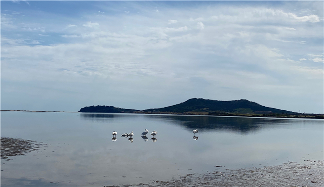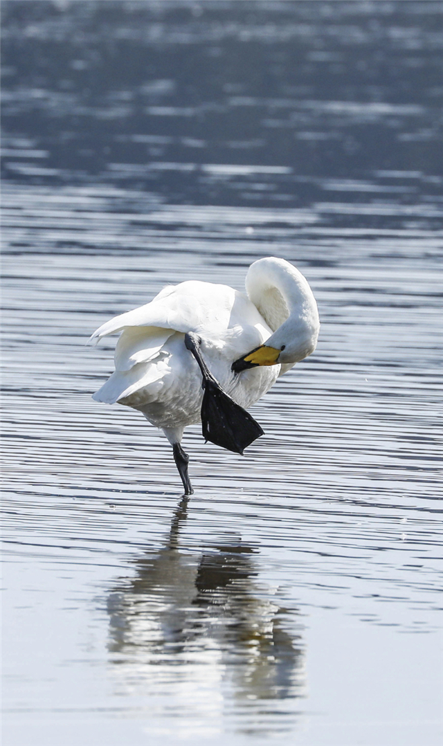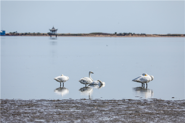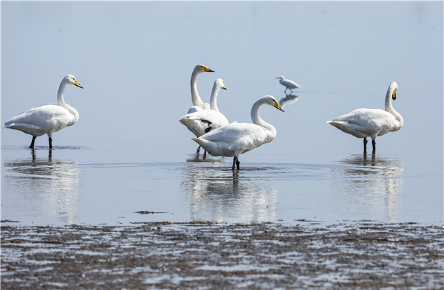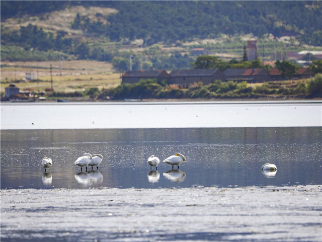 10月13日,5只大天鵝飛抵威海榮成大天鵝國家級自然保護區,與1只因傷滯留保護區的大天鵝團聚。據悉,這是今年到威海越冬的首批大天鵝。