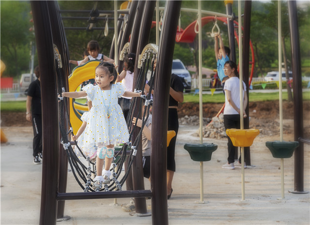 ??????從早上到夜晚,連珠園的親子樂園里都笑語不斷,孩子們在五彩游樂設施里玩得不亦樂乎。57歲的市民董義華帶著2歲的孫女常來到連珠園打卡。董義華覺得文登的變化太大了,走上一會就能遇上一個口袋公園,這個假期光逛公園日程就排滿了。