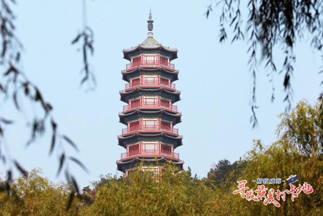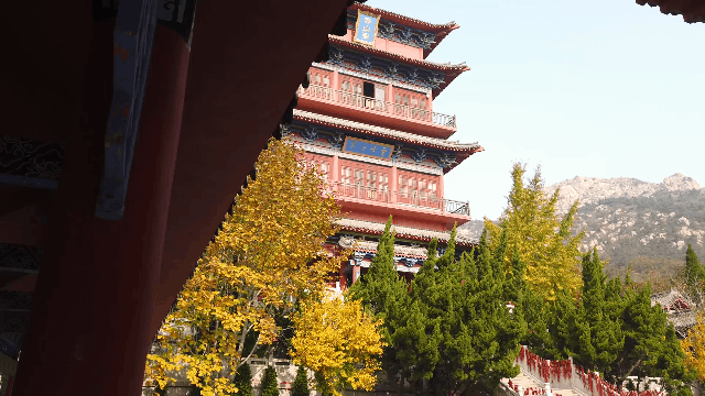 ????赤山的秋色是叫人眼花繚亂的,但也帶了些虛實(shí)結(jié)合的美。漫山叢林中,幾殿宮宇分散矗立,高塔從大片的綠林中探出頭來(lái),留了些引人無(wú)限遐想的空間。