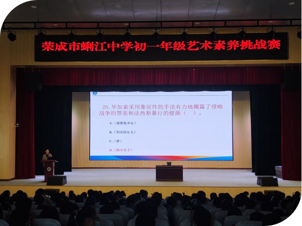 為進一步提升學校藝術教育工作,豐富校園文化活動,展示學校的藝術教育風采,培養和提高學生欣賞美、創造美的能力,發展他們的才能,11月5日,榮成市蜊江中學在報告廳隆重舉辦了初一年級藝術素養挑戰賽。