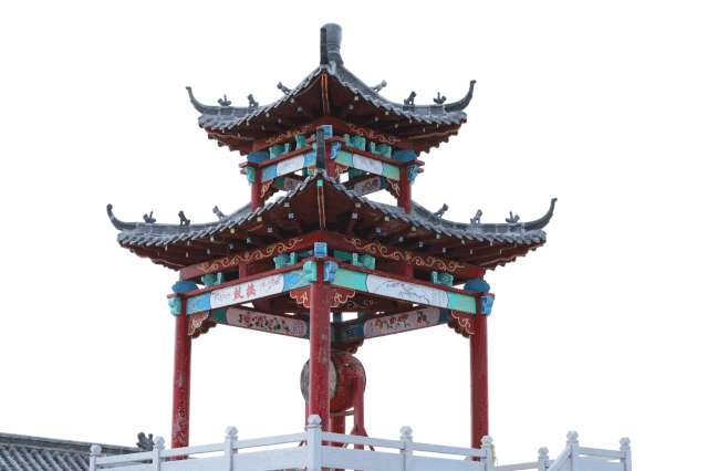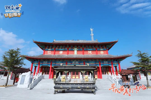 ????最高處的鐘樓鼓樓遙相對應,古色古香的建筑,在殿前兩側見出對稱之美。殿外門前貼著“海晏河清世太平,風調雨順民安樂”的對聯,滿載著人們對幸福安寧生活的祈盼。