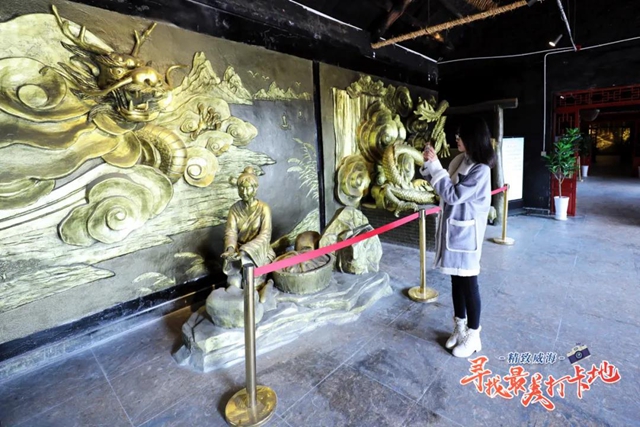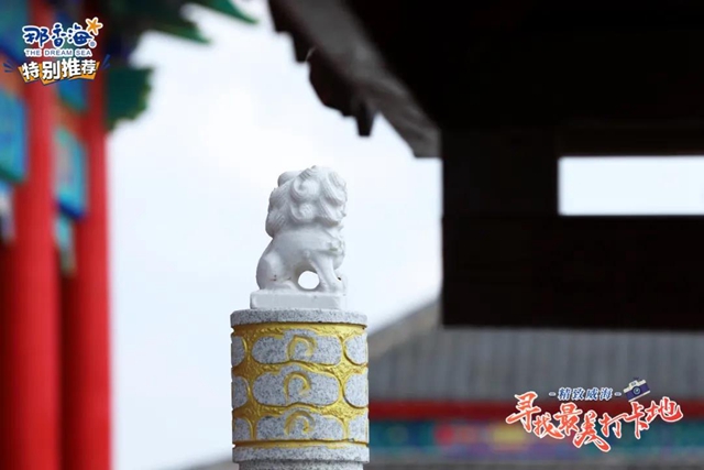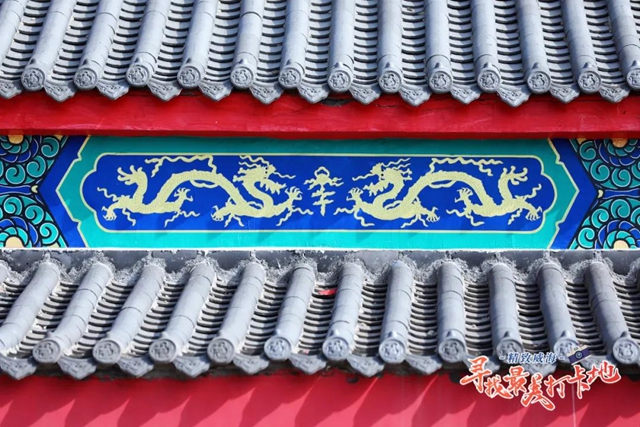????民俗園遍布著形態各式的龍雕塑,大門臺階中央的浮雕氣勢恢宏,每個石柱上的雕塑都軟萌可愛,而在房檐上相對稱的龍則多了幾分威嚴感。