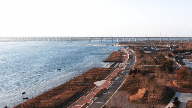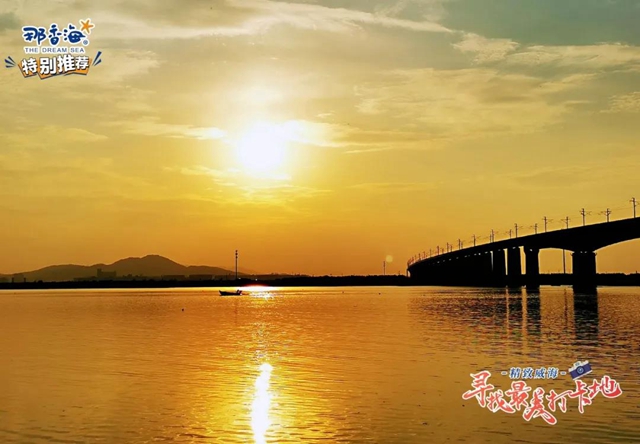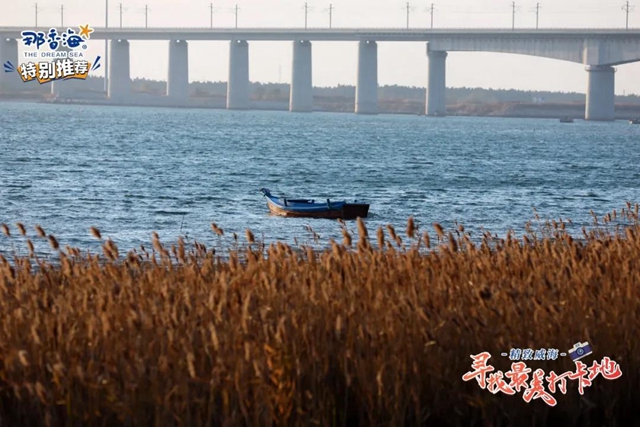 ????沿著蜿蜒曲折的木橋一路向西,湛藍的海出現(xiàn)在視線里,遠處有雙島灣大橋的掠影,時不時有動車飛馳而過,像是白色的蛟龍劃過天際,成為一道亮麗的風(fēng)景線。