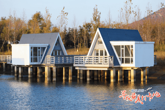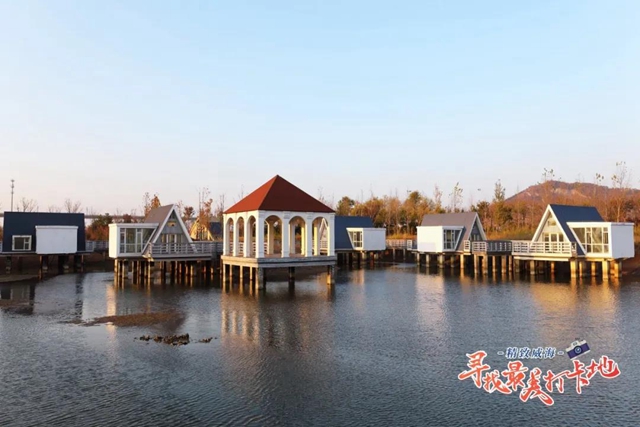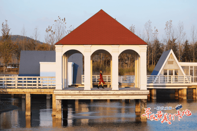 ????再往前有一片造型別致的水上建筑,紅頂白柱的亭子、藍頂棱柱狀的房子……頗有異域風(fēng)情,仿佛誤入圣托里尼。