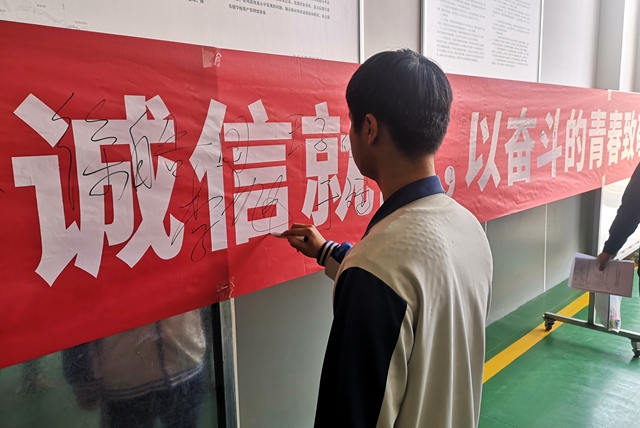 ????“我承諾:如實向用人單位介紹自身情況,在工作中做到誠信處事,自覺抵制各種失信行為,共同塑造‘誠信威海職?!拿篮眯蜗蟆?1月25日,威海市職業中等專業學校汽車工程部召開2018級實習學生“誠信就業”大會,于斌、羅德陽等學生在誠信實習承諾書上鄭重簽下自己的名字。