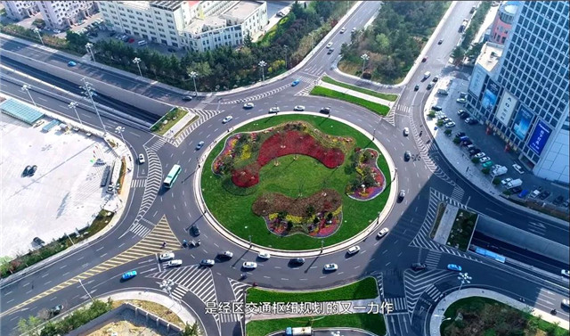 ??????環島改造工程,是經區交通樞紐規劃的又一力作,擁堵時段通行能力提升60%,今年重點實施“三季有花、四季有色”景觀建設,實現了“堵點”向“亮點”的轉變。