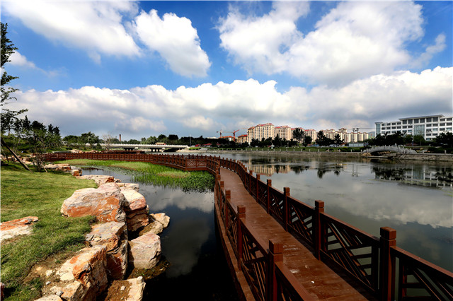 ??????按照中德生態示范城市指標體系,采用海綿城市技術,將原生態地形地貌與空間規劃、景觀小品有機融合,配套建設月季廣場、親水棧橋等10余處景觀節點,新建2處攔水壩,有效提升羊亭河生態涵養能力,滿足居民休閑娛樂、旅游觀光、體育健身等多樣化需求。