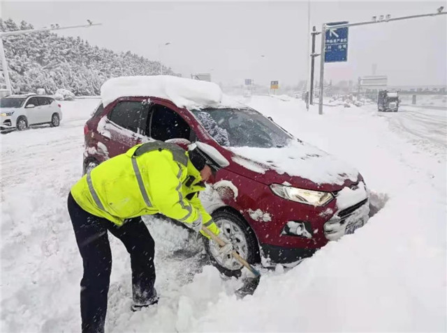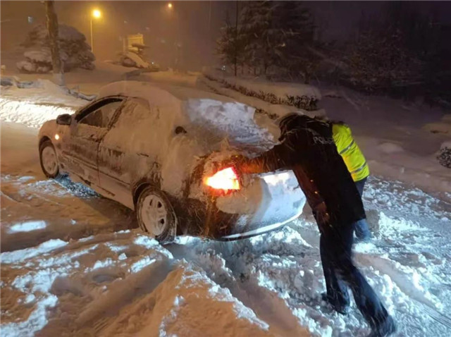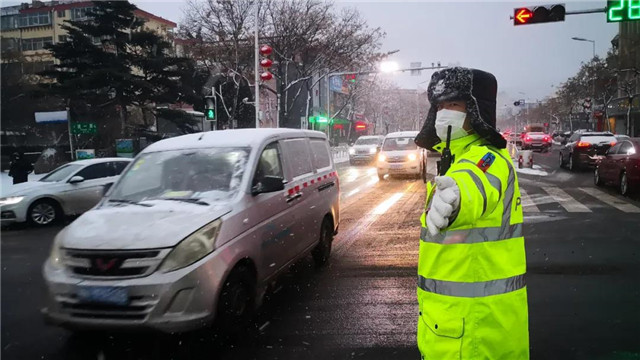 ??????▲指揮交通、幫忙推車……風雪中,交警堅守崗位。