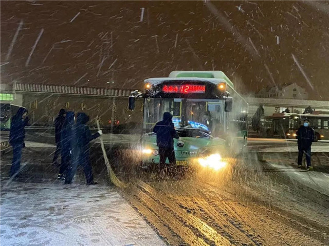 ??????▲威海公交集團科學調度車輛,全體職工浴“雪”奮戰,確保安全出行。