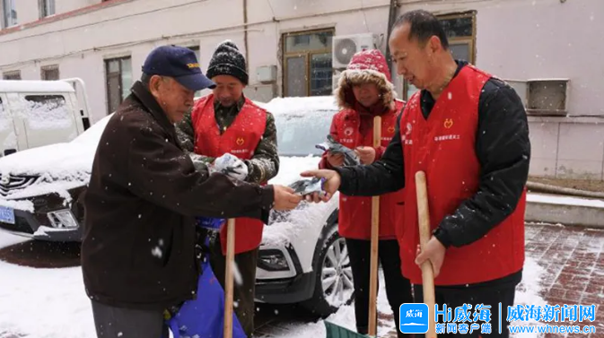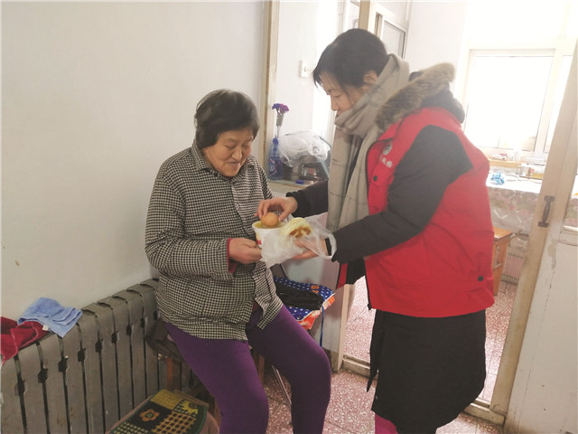 ??????▲環翠區鯨園街道萬福社區工作人員為空巢老人送熱飯。