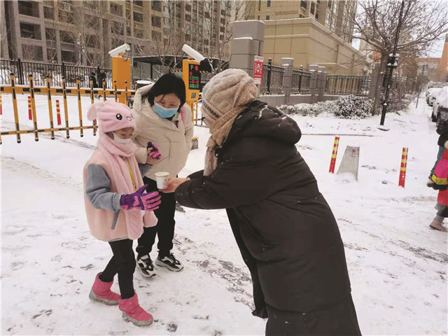 ??????▲經區鳳林街道錦宏社區陽光海上城小區為出門的居民送上姜絲可樂。