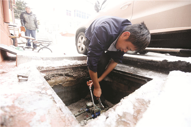 ??????▲寒潮前,市水務集團中心區供水公司工作人員張冉為保供水,赤手搶修水表。