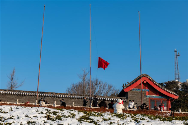 在迎接新年第一縷陽光后,龍眼港出入境邊防檢查站的戰(zhàn)士們?cè)谑蓟蕪R舉行2021年首次升旗儀式,莊嚴(yán)的國旗在祖國邊防線升起,在場所有游客面向國旗行注目禮,祝愿在新的一年國泰民安。