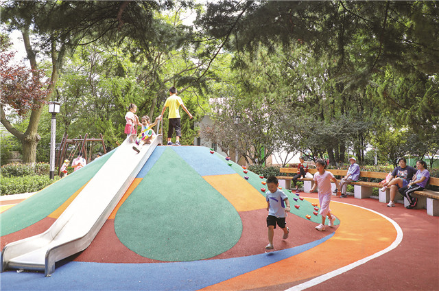 攀巖、滑梯、秋千……孩子一看見游園里的娛樂設(shè)施,就興奮地像脫韁的“野馬”。自從家門口的天都游園改建完成后,“孩子往商場、游樂場跑的次數(shù)少了。”苗永娟再也不用每天帶著外孫女往游樂場趕了。