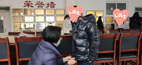 ??????積極聯系社會公益組織為學生送愛心。威海五號陽光公益組織來學校給建檔立卡的學生捐贈過冬衣物,送來溫暖。