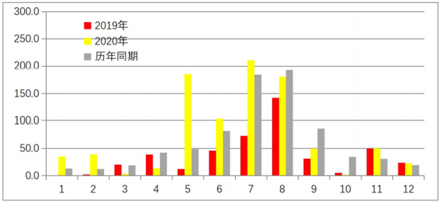 2020年全市共有3場(chǎng)暴雨過(guò)程,分別為5月17日至19日降雨63.7毫米、7月18日至20日降雨79.9毫米、7月22日至23日降雨90.2毫米。