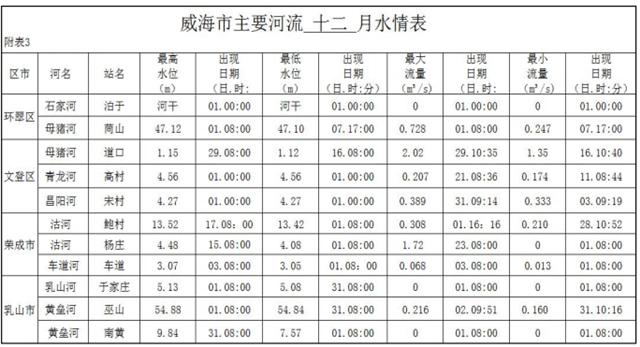 2020年12月,全市降水充沛,全市主要河道情況:母豬河道口站最大流量為2.02立方米每秒,沽河鮑村站最大流量為0.308立方米每秒。沽河楊莊站由于上游橡膠壩放水,最大流量為1.72立方米每秒。石家河泊于站由于上游泊于水庫(kù)蓄水,該斷面無(wú)過(guò)水。