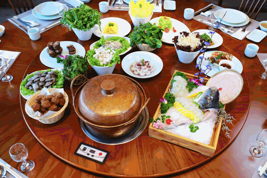 在抱海大酒店,除用河豚肉涮火鍋外,還可以點其他配菜,肉類、海鮮、丸子……種類齊全,應有盡有。