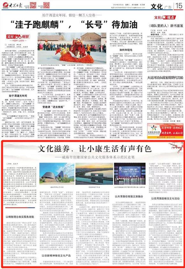 ??????2月2日,《大眾日報》文化版報道《文化滋養,讓小康生活有聲有色——威海創建國家公共文化服務體系示范區走筆》,聚焦威海創建國家公共文化服務體系示范區的工作經驗。