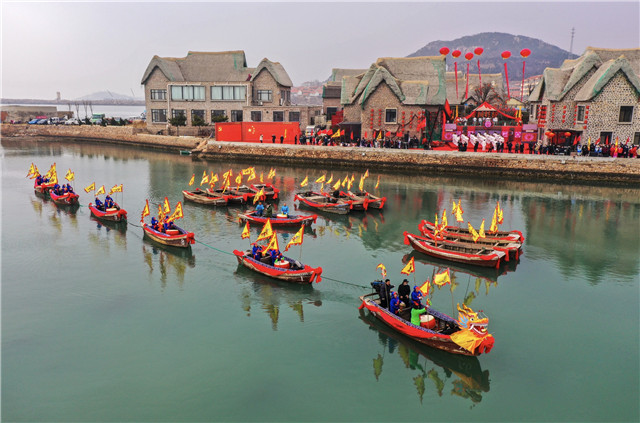 ??????晚會以榮成特色漁家文化為主基調,分為“祭海神”“慶豐收”“送祝福”“漁家樂”四個板塊,涵蓋舞龍舞獅、舢板鼓樂、書法送福、非遺大集等環節,展示了漁村農民新風貌、豐富多彩的海洋文化民俗、濃郁的膠東漁家特色。