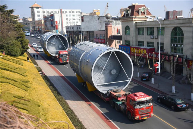 ??????該批設(shè)備是石島重工為海南某石油化工企業(yè)生產(chǎn)的主反應(yīng)器,共7件,總貨值上千萬元。其中4件直徑7米、長(zhǎng)14米,每件重達(dá)90噸。據(jù)了解,這也是石島重工節(jié)后復(fù)工以來,首批次通過海路外運(yùn)的超大型設(shè)備。為確保這批超寬超高設(shè)備順利運(yùn)輸,石島管理區(qū)交警、市政等部門積極配合,安排工作人員隨時(shí)疏導(dǎo)從廠區(qū)至港口途中的各種問題。