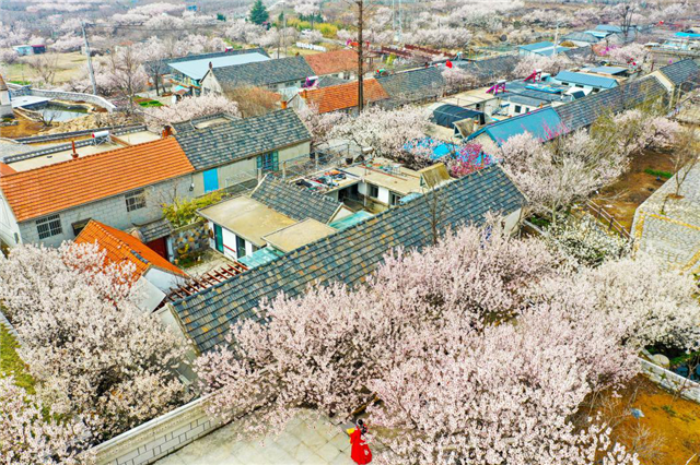萬畝櫻桃花競相開在連綿的青山腳下,滿眼春光,和著小橋流水和裊裊炊煙,像一幅徐徐展開的田園畫卷。