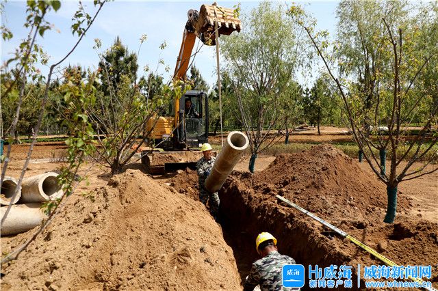 ??????沿著小路向西漫步,一片密林之后,一處水塘赫然出現,四周錯落擺放著景觀石。據施工現場工作人員介紹,公園原本就有一處池塘,引羊亭河水入池,正好可以打造景觀節點——荷塘月色,供游人休憩、觀賞,感受靜謐之美。