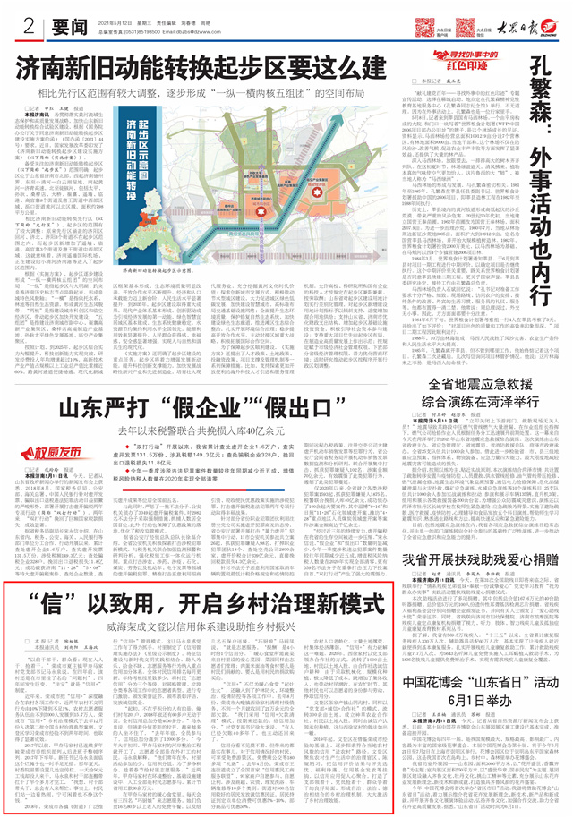 5月12日,大眾日報要聞版報道《“信”以致用,開啟鄉村治理新模式》一文,聚焦威海榮成、文登“信用+”助力鄉村振興的做法。以下為報道全文: