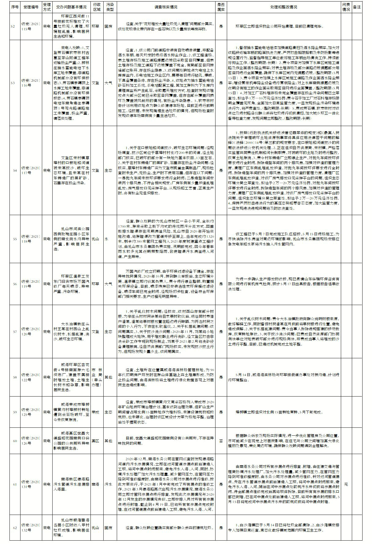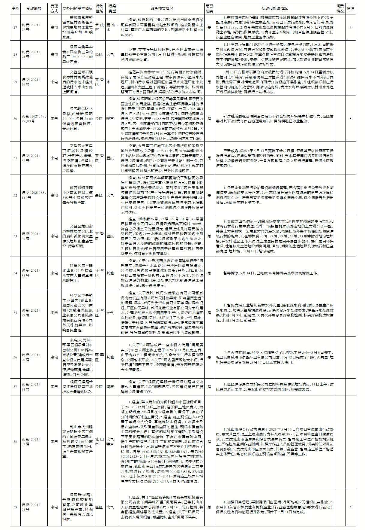 山東省第五生態環境保護督察組向我市交辦第二批信訪件共計94件(重復件32件)。截至5月19日12時,已全部辦結。其中屬實89件(重復件32件),不屬實5件。
