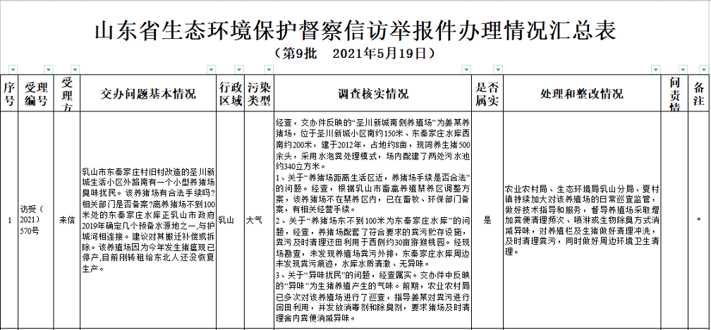 ??????山東省第五生態環境保護督察組向我市交辦第九批信訪件共計61件。截至5月26日12時,已全部辦結。其中屬實54件,不屬實7件。