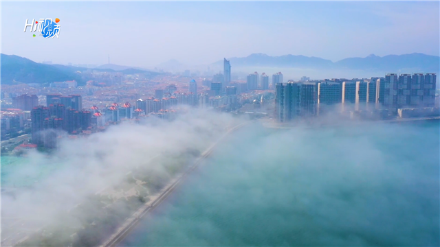 ??????近日,威海海邊出現(xiàn)平流霧景觀,城市的公園、山巒、樓宇在平流霧中若隱若現(xiàn),宛如仙境。