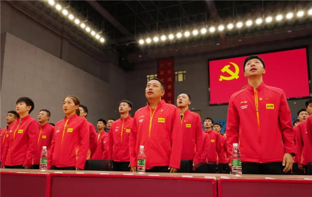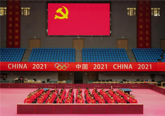 ??????7月1日,正在威海南海國家乒乓球訓練基地備戰東京奧運會的中國國家乒乓球隊,全體人員身著紅色領獎服,黨員佩戴黨徽,在黨旗和國旗下莊嚴列隊,集體觀看慶祝中國共產黨成立100周年大會。