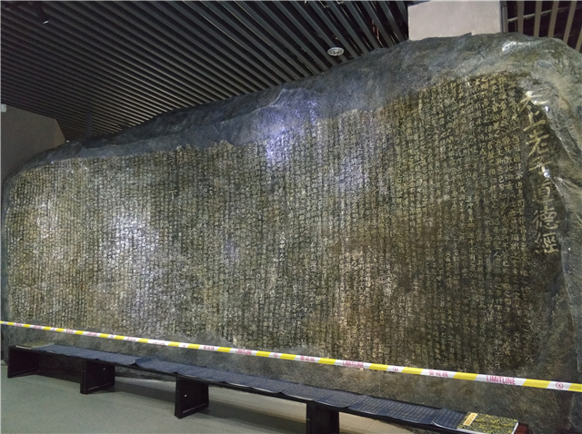 道德經摩崖刻石位于文登區葛家鎮西于疃村北圣經山上,為國家級重點文物保護單位。巨石似新月屹立,高5米,寬15.6米,俗稱“月牙石”。陽面陰刻“老子道德經”上下兩卷,146行,6000余字,字徑10厘米左右,楷體豎書,落款已模糊。
