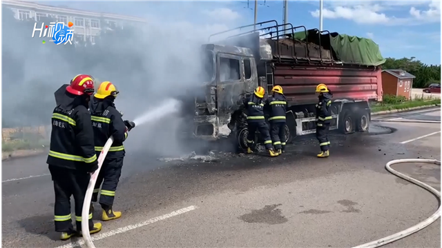 7月19日,途經文登區宋村鎮北馬村公路附近的一輛大貨車不明原因著火,轄區廣州路消防救援站立刻出動趕往事發地點進行救援。
