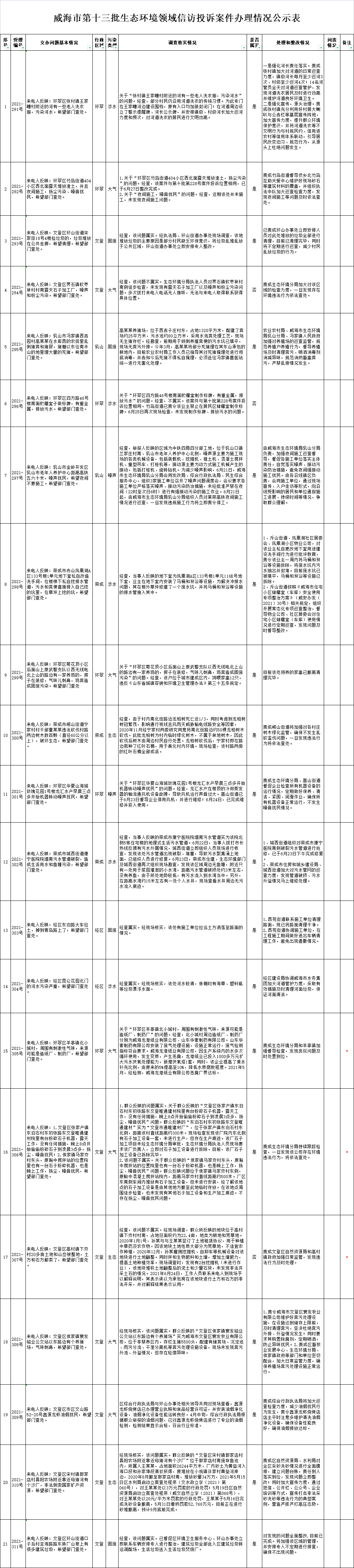??????威海市第十三批生態(tài)環(huán)境領(lǐng)域信訪投訴案件交辦清單共計(jì)21件。截至8月1日17時(shí),已全部辦結(jié)。其中屬實(shí)18件,不屬實(shí)3件。