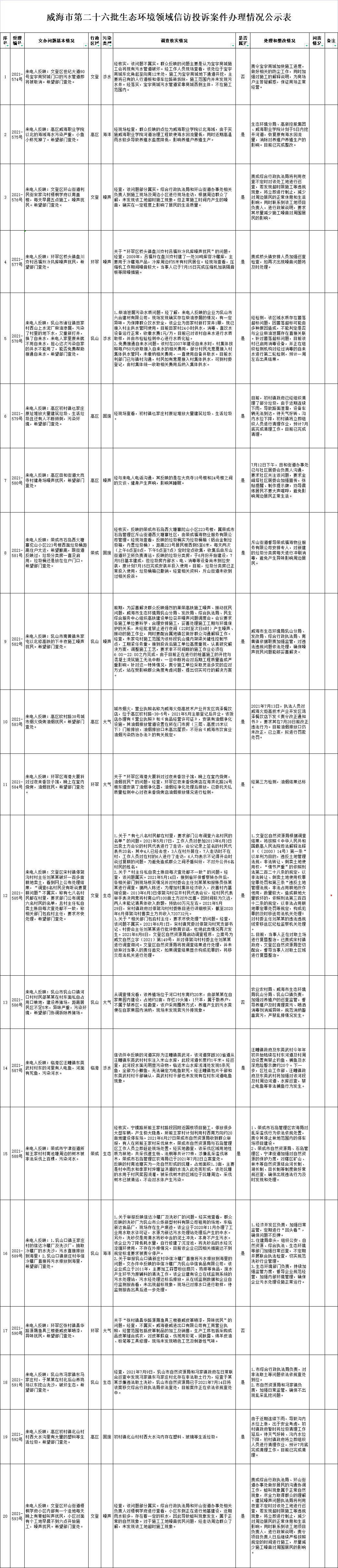 ??????威海市第二十六批生態環境領域信訪投訴案件交辦清單共計20件。截至8月15日17時,已全部辦結。其中屬實17件,不屬實3件。